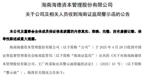 海南证监局还在警示函中称,海德股份上述行为违反了相关规定,海南证监局决定对海德股份和王广西采取出具警示函的监督管理措施,并记入资本市场诚信档案数据库。